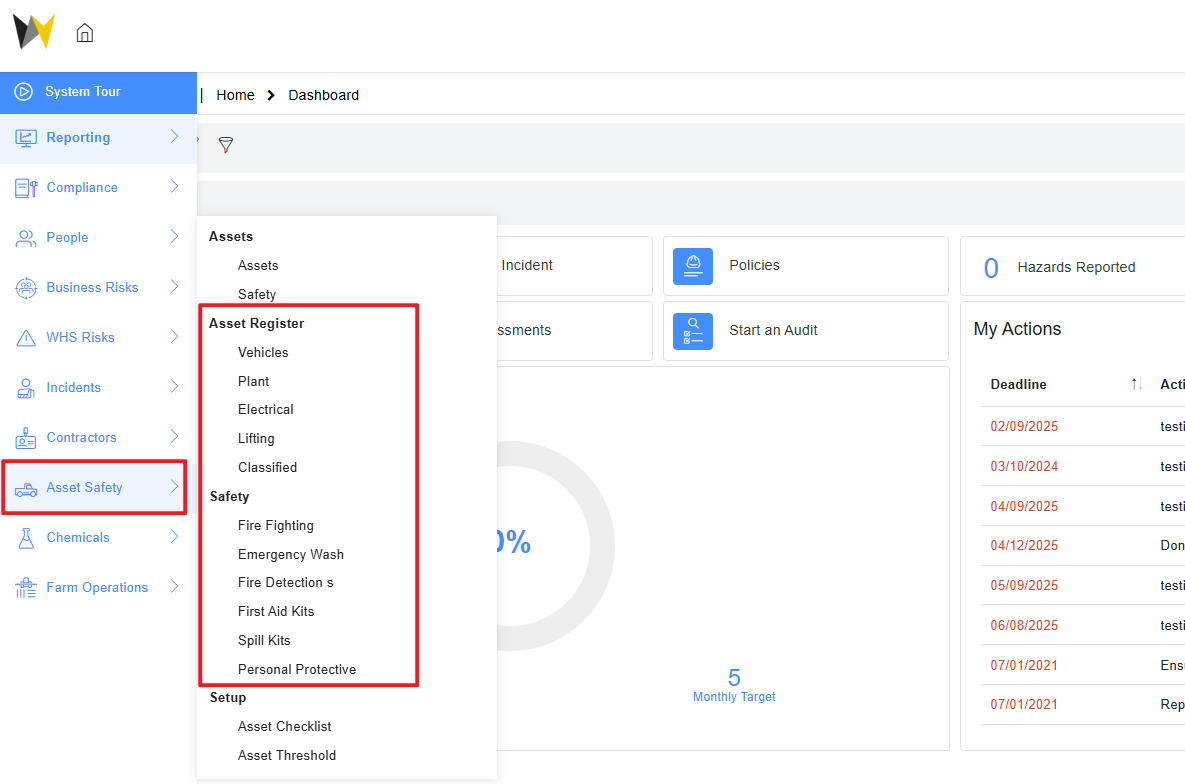 1. Overview The Asset Safety Management module allows for users to record and report on inspections, condition and maintenance of all plant, machinery, vehicles and safety equipment. Each asset can be recorded in the relevant register, with its ...