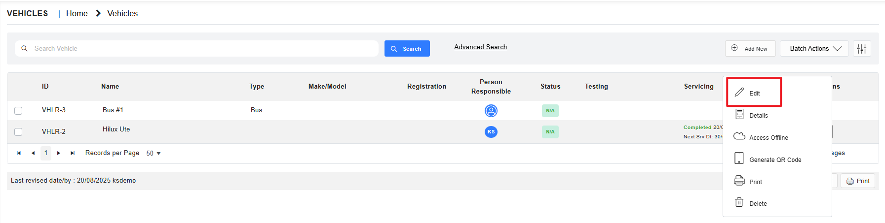 Step 2: Use the three dots menu for asset options: edit records, view summaries, enable offline access, generate QR codes, or print and delete entries.
