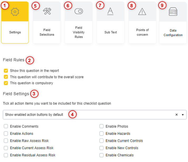 - Field Settings – Allows for additional functions to be enabled for the field, such as comments, photos, actions and dynamic risk assessment.