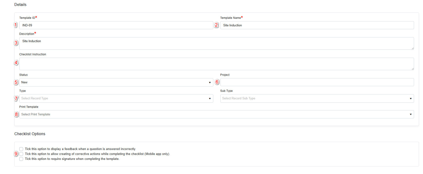 - Template Name – The title should describe the purpose of the template e.g. Site Safety Observation.